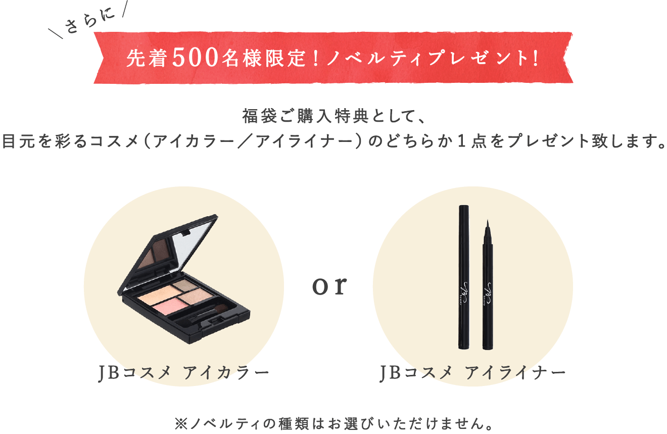さらに、福袋購入特典として、先着500名限定で目元を彩るコスメ(アイカラー / アイライナー)のどちらか1点をプレゼント致します。